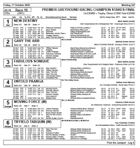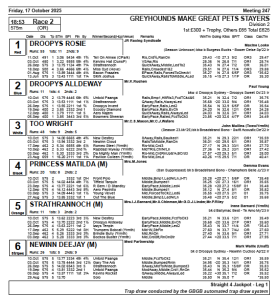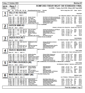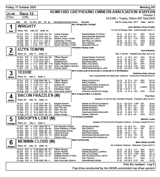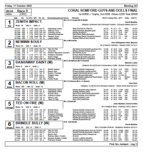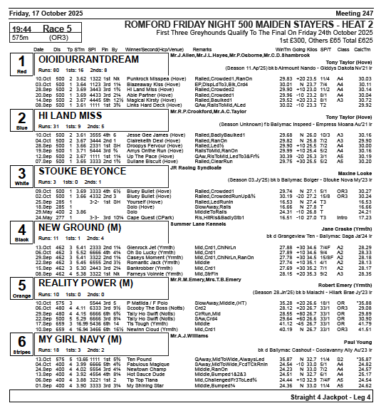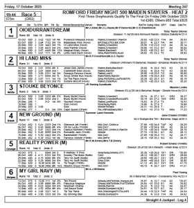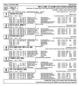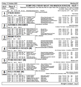 Coral Romford Guys and Dolls and Premier Greyhound Racing Champion Stakes Finals and supporting opens in stats
