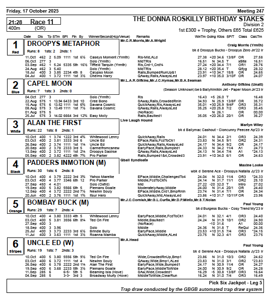 6 | Rolo Rosie | 4 | 17 | 24% | £1,350 | -£4.21 | 2 | 4 | 50% | £0.71 | 0.00 | 0.00 | 0.00 | 0 | 0 | 2 | 84 |