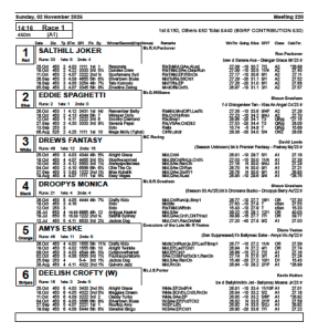 | A1 | 1 | Foxwood Christy | 1 | 4 | 25% | £350 | -£2.09 | 1 | 2 | 50% | -£0.09 | 1 | 4 | 25% | 3.98 | 26.99 | 26.89 | 6 | 6 |