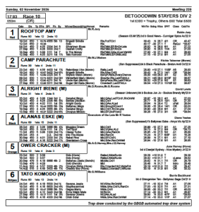 | OR | 1 | Savana Pretty | 10 | 66 | 15% | £3,395 | -£28.17 | 4 | 24 | 17% | -£14.67 | 0 | 0 | 0.00 | 0.00 | 0.00 | 6 | 25 | |