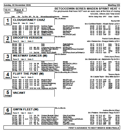 | OR | 1 | Cloughtaney Chaz | 10 | 35 | 29% | £2,570 | -£1.96 | 4 | 7 | 57% | £1.29 | 4 | 13 | 31% | 15.12 | 15.06 | 2 | 7 | |