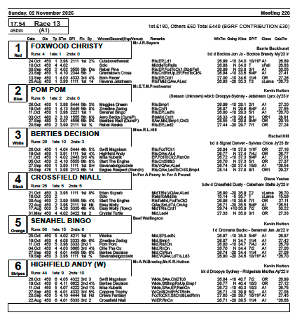 | A1 | 1 | Foxwood Christy | 1 | 4 | 25% | £350 | -£2.09 | 1 | 2 | 50% | -£0.09 | 1 | 4 | 25% | 3.98 | 26.99 | 26.89 | 6 | 6 |