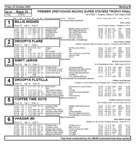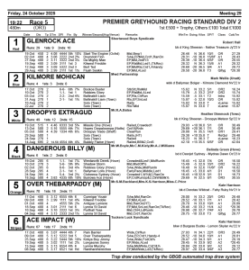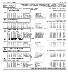 | Draw | Greyhound | W | R | % | TPM | +/- | *W | *R | *% | *+/- | BST | BAT | BCT | CW | CR | CD% | DLR | DLW |