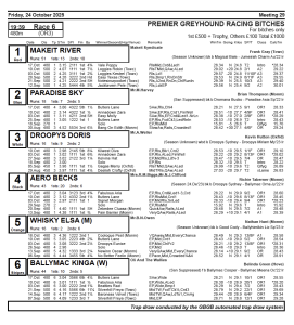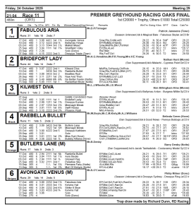 Premier Greyhound Racing Oaks and Arena Racing Company Scurry finals and supporting opens in stats