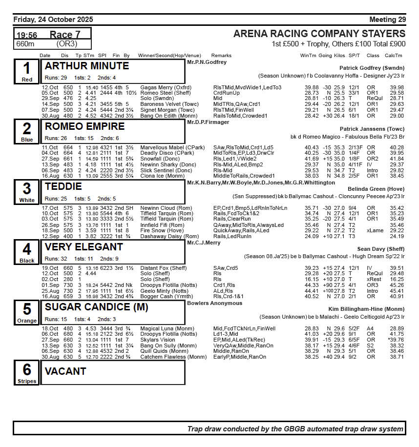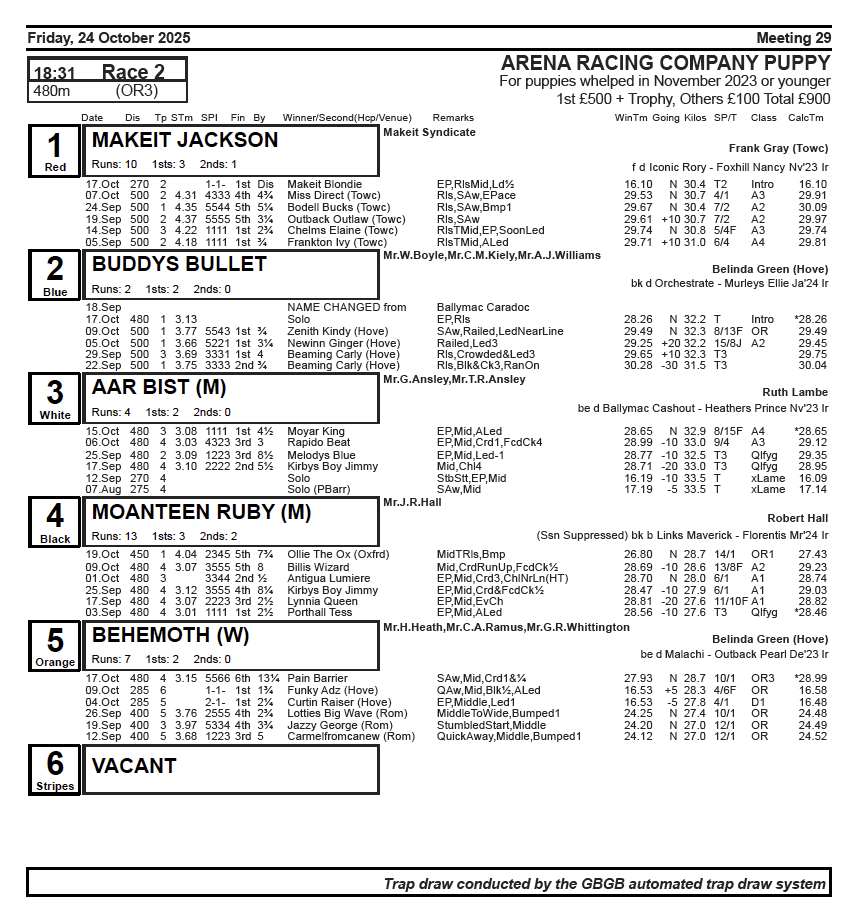 | Draw | Greyhound | W | R | % | TPM | +/- | *W | *R | *% | *+/- | BST | BAT | BCT | CW | CR | CD% | DLR | DLW |