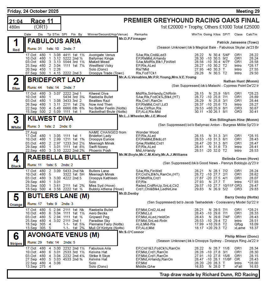 The full form and stats ahead of Dunstall Park’s Friday card which includes the Premier Greyhound Racing Oaks and Arena Racing Company Scurry finals