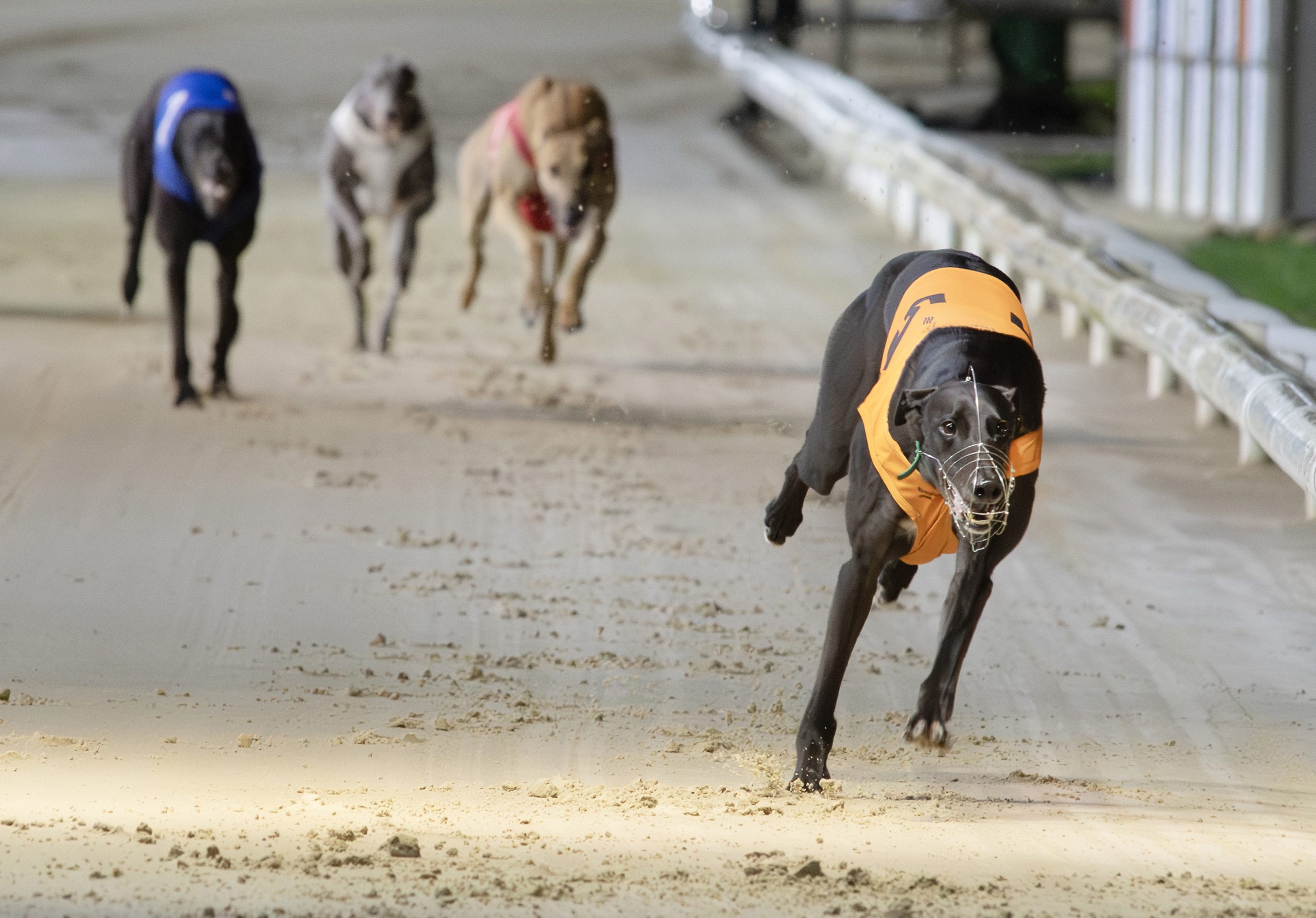 Pacing up to lead despite a wider draw than was ideal in the £20,000 final over 500m, the Mark Wallis-trained September 2022 son of Droopys Sydney and Powerful Mush shot clear of crowding behind for a runaway victory, crossing the line 15 and a quarter lengths clear of staying-on kennelmate Kilmore Dancer in 28.95sec (+30), taking five spots off March On Freddie’s track record, for a Wallis-trained one-two.