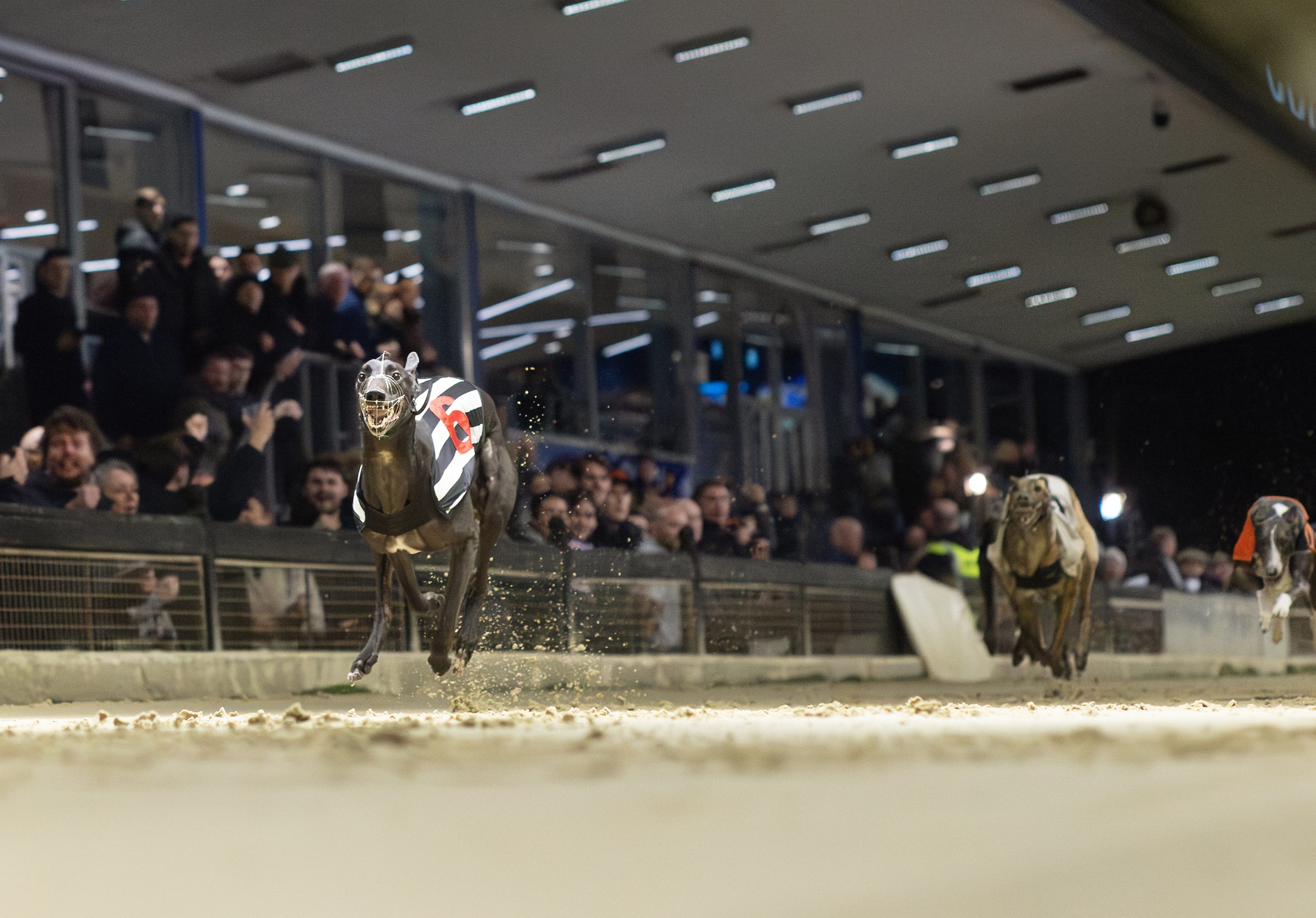 Sent to traps the 6-5 favourite after impressive and runaway wins in heat and semi-finals – clocking the fastest time of the night on both occasions – the December 2022 son of Broadstrand Bono and Swift Acoustic was led from the boxes by Out The Blue as she made a good first of trying to keep the famous trophy with local trainer Maxine Locke after Droopys Eunice’s win 12 months ago.